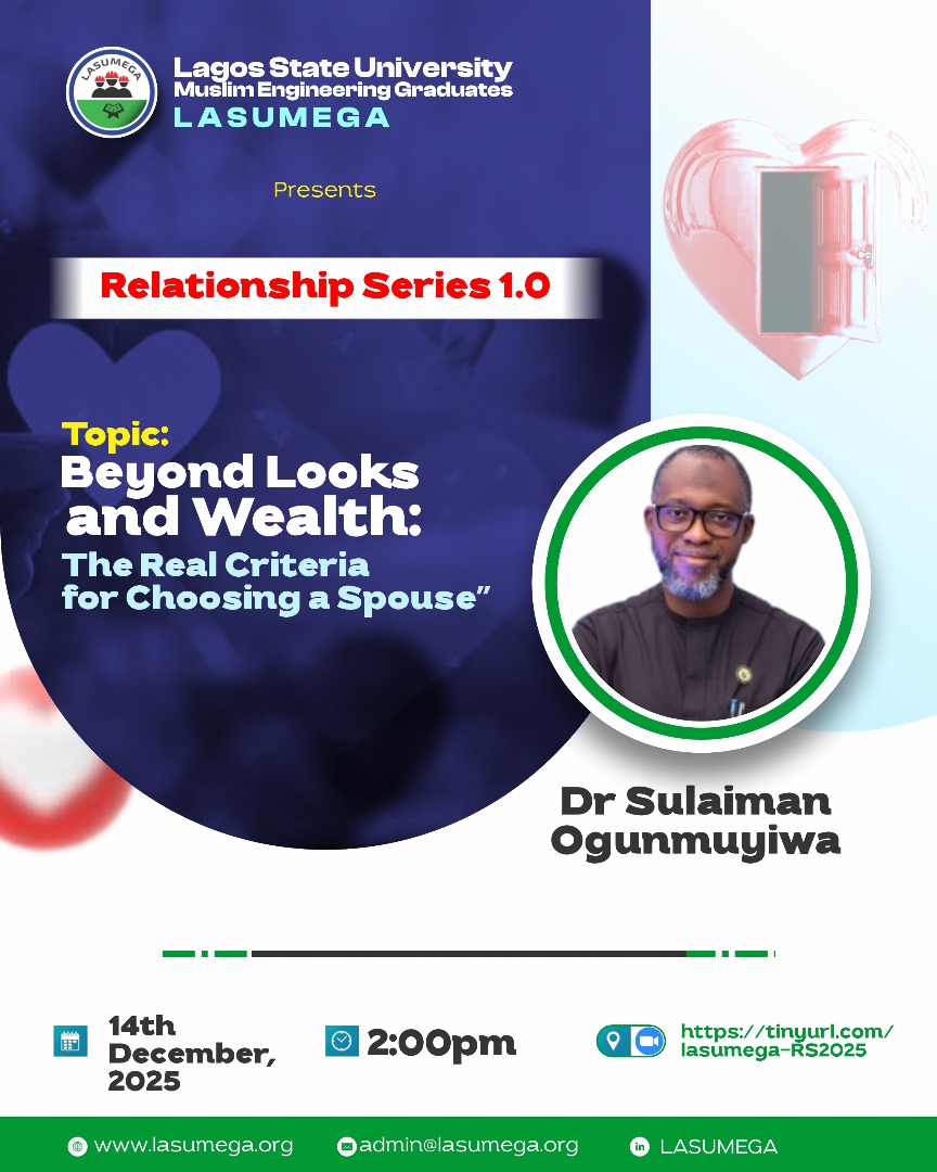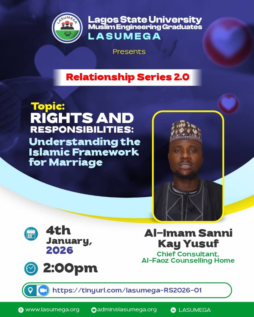 Virtual EventLASUMEGA is pleased to invite you to Relationship Series 2.0, an insightful session carefully designed for singles, married couples, and those preparing for marriage titled "Rights and Responsibilities: Understanding the Islamic Framework for Marriage". Our Guest Speaker Al-Imam Sanni Kay Yusuf, Chief Consultant, Al-Faoz Counselling Home (Chief Imam, Al-Faoz Central Mosque) will shed light on […]